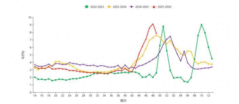 2022-2026 年度北方省份哨点医院报告的流感样病例%,数据来源于中国疾控中心。